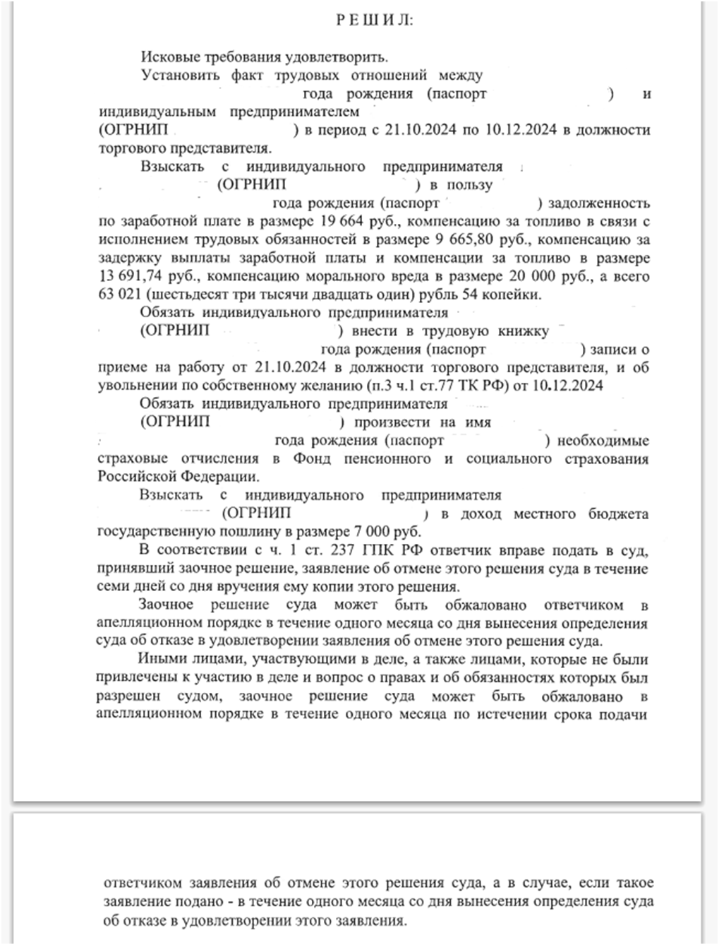 Наша доверительница, понимая риски работы без заключенного трудового договора, обращалась к работодателю с вопросом о его заключении, но положительной реакции от него не последовало. А спустя два месяца работодатель и вовсе уволил нашу доверительницу, сославшись на недобросовестное отношение к труду. При этом работодатель не произвел полный расчет как по заработной плате, так и по гарантированной компенсации за топливо, оставив нашу доверительницу без денежных средств на новогодние праздники.