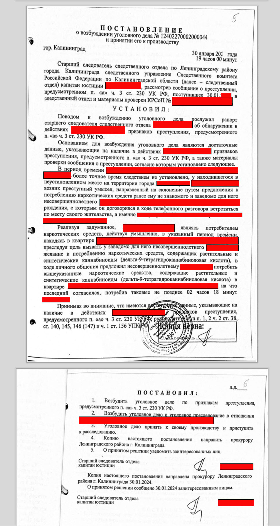 Старшим следователем следственного отдела следственного Управления Следственного комитета РФ было возбуждено уголовное дело в отношении НАШЕГО ДОВЕРИТЕЛЯ по п. «а.» ч. 3 ст. 230 УК РФ по факту того, что в период времени с 22 часов 30 минут до 02 часов 18 минут, более точное время следствием не установлено, у находившегося в неустановленном месте на территории города Калининграда у НАШЕГО ДОВЕРИТЕЛЯ возник преступный умысел, направленный на склонение путем предложения к потреблению наркотических средств ранее ему не знакомого и заведомо для него несовершеннолетнего, с которым он договорился в ходе телефонного разговора встретиться по месту своего жительства, преследуя цель вызвать у заведомо для него несовершеннолетнего желание к потреблению наркотических средств, содержащих растительные и синтетические каннабиноиды (дельта-9-тетрагидроканнабиноловая кислота), в ходе личного общения предложил несовершеннолетнему потребить вышеуказанные наркотические средства, содержащие растительные и синтетические каннабиноиды (дельта-9-тетрагидроканнабиноловая кислота) на что последний согласился, потребив таковые.